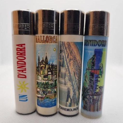 Mecheros Clipper originales Ciudades del mundo: Andorra, Torremolinos, Benidorm y Mallorca fabricados en España. Una serie de 4 mecheros Clipper para todos los coleccionistas de mecheros Clipper del mundo.